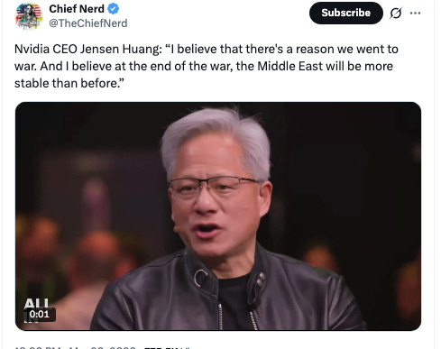 It surprised me that it's taken this long for investors to catch on to the market manipulation. For the most part, Wall Street has gone along with the Trump administration's spin. I don't generally think speculators are gullible. But in this case, they have been. Iran, to them, has no credibility in the markets. On CNBC, Jim Cramer veers between confidence the war is over, and disbelief that this war is not under Trump's control. Unlike his usual schtick of calling CEOs or billionaires and asking them what big money is going to do, he has no sources in Iran he can call. Similar Wall Street guys, like Nvidia CEO Jensen Huang, are pumping the market.