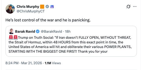 It's a very odd situation, to have military threats and timing dictated in part by what will worry speculators. But the half-life of these kinds of comments is shortening; I suspect the market will continue its slow slide. Market participants, and political opponents, are giving less credence to Bessent and Trump, because it's clear they aren't in control of the situation. As Senator Chris Murphy put it, the panic is pretty obvious.
