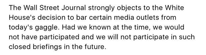 While conservative outlets such as Breitbart, One America News and the Washington Times were allowed into Friday's briefing, Politico, the New York Times and CNN were not, according to the Times' Michael Grynbaum. The White House Correspondents' Association, representing the White House press pool, released a statement indicating that it was "protesting strongly" against the way the briefing was handled. The New York Times' executive editor, Dean Baquet, told his paper's reporter that "nothing like this has ever happened at the White House in our long history of covering multiple administrations of different parties." CNN called it "an unacceptable development" that was "how they retaliate when you report facts they don't like." On Twitter, The Washington Post's executive editor, Marty Baron, called the move "appalling."