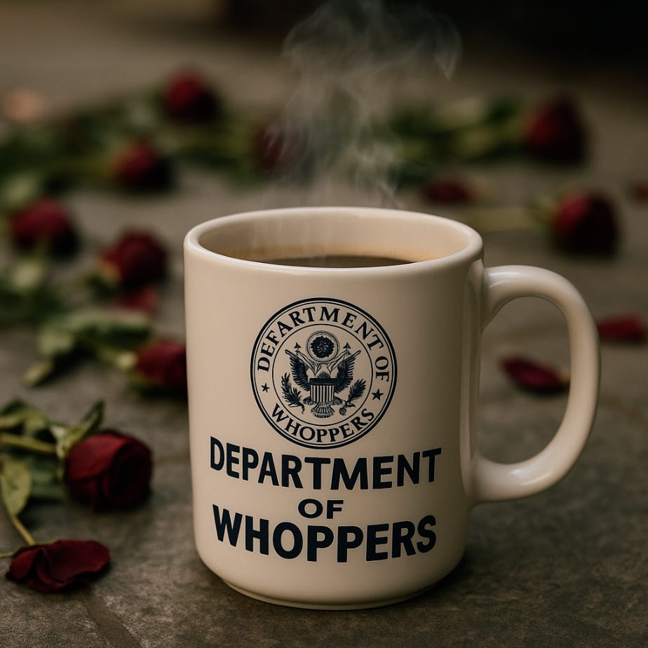 Good morning! Donald Trump held court in what's left of the Rose Garden last night, a ceremony he dubbed the inaugural meeting of the "Rose Garden Club." The roses, he reassured us, were untouched, "in full bloom and they will be in full bloom during certain seasons", as if the country needed a botanical State of the Union. The grass, though, was apparently a national emergency: "Every time we'd have a press conference, women in particular were sinking deep into the mud." So, at taxpayer expense, the turf was replaced with stone. Call it the Augusta National approach to governance: re-grass America and the rest will sort itself out. The evening spun into something between a loyalty banquet and a stand-up routine nobody asked for. Trump lavished praise on Mike Johnson, the "great speaker of our time or any other time," and reminisced about those long nights when he had to call "Jim" and a dozen other "hard-nos" at 4 a.m. to twist arms. The lucky guests tonight, however, were the chosen ones, the lawmakers who never made him pick up the phone. In Trump's telling, this was their reward: a steak dinner under the fairy lights, serenaded by the sound of a safe Washington, where women are now "walking by themselves alone, and they feel totally safe." He even insisted crime in D.C. had been reduced by 87%, "Really? Who are the 13%?", suggesting the remaining criminals had either been vaporized or relocated to Portland. And just to gild the lily, he added a folksy homily about turf management: "Grass has a life like we have a life. It expired about 40 years ago in these parks." As if America's greatest threat were not economic collapse or foreign war, but geriatric sod in Lafayette Square. The crowd was also treated to the soundtrack of an oncoming train, which Trump hailed as proof of his success: "The train is safe now. We don't have to worry about it. Isn't that a beautiful sound?" One imagines Kim Jong Un nodding in recognition at this level of propaganda-by-landscaping. The speech lurched from one tall tale to the next. He bragged that his "great big beautiful bill" had abolished taxes on tips, overtime, and Social Security, thrown in car loan deductions for good measure, and, why not, basically solved the economy forever. He claimed to have stopped seven wars, one of which had allegedly raged for 37 years until he personally ended it in two hours. "Nobody's done what we've done in seven months," he boasted, before clarifying that even the "fake news" admitted his record was unparalleled. He waxed nostalgic about ordering a B-2 bombing run over Iran, with pilots "who look just like Tom Cruise," and swore that "no other president had the courage to let us go." He celebrated the imminent arrival of $17 trillion in investments, including AI factories that are apparently wiring themselves directly into the power grid like something out of The Matrix. To put that whopper in perspective, China's entire GDP is roughly $18 trillion, but Trump would have us believe he conjured almost the same amount in loose change between Rose Garden banquets. And he recounted, with childlike glee, that his White House doctor once declared him "by far the healthiest" president compared to Bush and Obama, a line delivered as though it were the Nobel Prize of wellness. For good measure, he tossed in another flourish: "We were one heart attack from losing the House," as if the nation's fate had hung by the clogged artery of a Republican backbencher. If the Rose Garden dinner was an ode to loyalty, his follow-up transcript from the White House presser was a reminder of fragility. Asked a clear question about Vladimir Putin, Trump looked blank until Melania leaned in like a caretaker prompting a patient: "They're asking about Putin, Donald." This is the president who insists he's winning world wars with Tom Cruise lookalikes, yet can't track a reporter's question without help from his wife. Instead of an answer, he muttered, "What? About who? I didn't hear," before drifting into a tangent about "a lot of people" and "great conversations" that never seemed to exist. At one point, he even tried to pivot into his well-worn mantra, "We have the strongest military anywhere in the world", as though sheer repetition could cover the lapse. The whole exchange felt less like a commander-in-chief briefing and more like a nursing-home check-in gone off script. But the real kicker was Trump's announcement that he's rebranding the Pentagon. Forget the Department of Defense, too "woke." He signed an executive order to bring back the old "Department of War." "War means something. It means we're not going to have any problems," he explained, as if renaming the building were the geopolitical equivalent of sprinkling holy water on it. Billions will now be squandered on swapping seals, signs, and stationery across 700,000 facilities, a contractor's dream disguised as a patriotic flex. The rollout was predictably botched: the Pentagon's website redirected to war.gov, which promptly crashed, while the official X account sported a shiny new avatar over the old Defense banner, like a teenager failing to change their MySpace background. Even Truman's ghost is spinning at this point. Allies abroad don't know whether they're negotiating with a defense partner or a country that just renamed itself belligerent on purpose. And while Trump's been busy fluffing the turf and rebranding the military, his immigration enforcers staged the largest workplace raid in Homeland Security history. Federal agents stormed Hyundai's $12.6 billion Metaplant project in Georgia, hauling off 475 workers, most of them Korean nationals, from what was supposed to be the state's biggest jobs engine. South Korea's government is fuming, Democrats in Georgia are calling it terror tactics, and Hyundai and LG executives are scrambling to explain why their flagship venture just became a crime scene. In the real world of actual war, Volodymyr Zelensky once again embarrassed Putin'