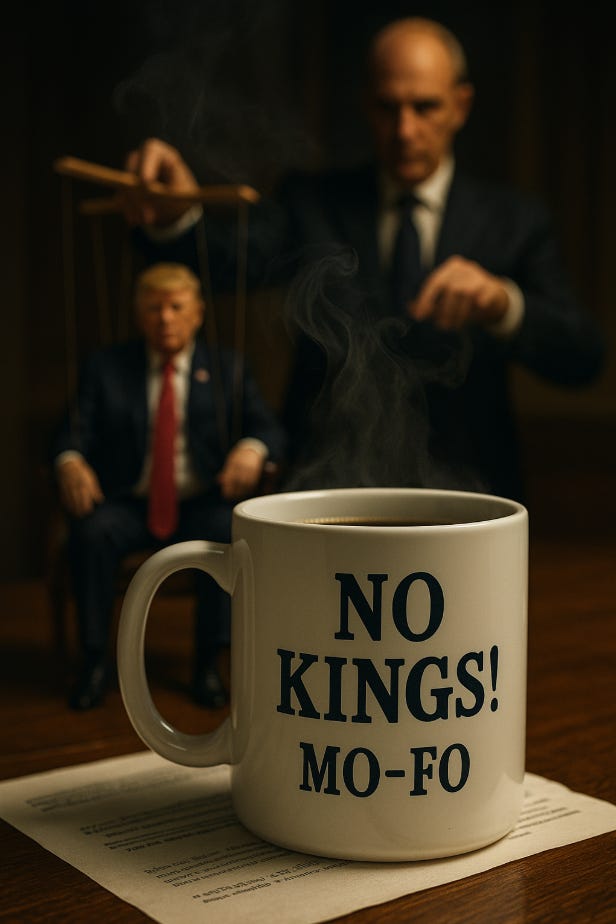 Good morning, and happy No Kings! day, that brief annual reminder that this country was supposed to be founded on the radical notion that no man should ever wield divine right over others. The Founders dumped tea into a harbor, fired a few warning shots at tyranny, and thought they'd settled the matter. Yet here we are, two and a half centuries later, watching a thin skinned, weak-minded, golden-haired monarch preside from the golf course while his courtiers in Congress genuflect and his shadow president sharpens the guillotine for democracy itself. Across the Atlantic, the United Kingdom, yes, the monarchy, did something our vaunted republic refuses to do. It actually held one of its own accountable. Prince Andrew, formerly His Royal Highness, Duke of York, Air Miles Andy, has finally been stripped of his title. After years of denial, pizza alibis, and the kind of sweating-related medical fiction you only hear from men cornered by truth, Buckingham Palace has finally pried the ducal crown from his head. The man who once lectured the BBC on his inability to perspire now finds himself sweating in exile, titleless, friendless, and forever haunted by his Epstein connection. In Washington, the Epstein files remain sealed tighter than a Mar-a-Lago safe. Congress, that mighty bulwark of checks and balances, has transformed into a body of professional enablers whose chief legislative purpose appears to be protecting Donald Trump's criminal exposure. Where Britain stripped a prince, America shields a predator. The U.K. preserves its monarchy by exiling rot; the U.S. rots by pretending it's still a democracy. The moral inversion is so complete it could be a work of performance art. In the kingdom, the crown is humbled; in the republic, the emperor grows fatter on deference. The so-called "Epstein transparency" effort has been reduced to a bipartisan whisper campaign of excuses. Evidently, what's fit for the royal family's reckoning is far too dangerous for America's elected one. And while Congress hides behind "ongoing reviews," it's also refusing to vote on something else: war. The Venezuela Authorization Act, or as it's known in shorthand, the "abdication clause", remains frozen in committee because no one wants to go on record opposing Trump's dream of a hemispheric war on "narco-terrorists." Legislators who once boasted of defending the Constitution have discovered that obedience pays better than oversight. The Founders, if they could stop spinning long enough, might appreciate the efficiency: a self-dissolving legislature that declares its irrelevance in the name of patriotism. Then comes the military subplot: Admiral Holsey, one of the few officers left who still believes the oath is to the Constitution, not to the man barking at clouds in the Oval Office. His resignation is the quiet sound of integrity, the rare act of conscience in a government that punishes it. Holsey left rather than salute a Pentagon turned political machine under Pete Hegseth's chaos command, and the silence from his peers was deafening. Nothing says "strong military" like officers tiptoeing through the moral minefield, praying not to step on their own careers. And looming over it all is Russell Vought, the unelected Rasputin of the Trump era. The "reaper" with the smile of a church deacon and the politics of Torquemada. Vought doesn't want to lead the country; he wants to discipline it. The man openly brags about "traumatizing" civil servants, as though governance were an exorcism and he the holy hammer of austerity. His goal isn't to serve the Constitution but to sanctify authoritarianism in evangelical packaging. "Christian nationalism," he calls it, as if Jesus came down from the mount to deregulate the EPA and fire the NIH. Trump may be the face, but Vought is the hand that moves the marionette. He sees democracy as an obstacle course, not a covenant. The self-described "shadow president," he chairs Project 2025's transition planning like a cleric preparing a coronation, executive orders pre-written, agency heads pre-fired, vengeance preordained. When Steve Bannon calls Trump an "instrument of the Lord," you start to realize the Lord in question has a Cato Institute subscription and a taste for bloodletting. In the land of hereditary monarchy, shame still carries weight. In the land of the free, shame is a partisan construct. Prince Andrew is dethroned for his friendship with Epstein; Donald Trump is deified for the same. Admirals resign in protest; senators resign themselves to irrelevance. And somewhere behind the velvet curtains of Project 2025, Russell Vought scribbles new commandments for a nation of loyal subjects who still insist they have no king. Happy No Kings! Day, America. |